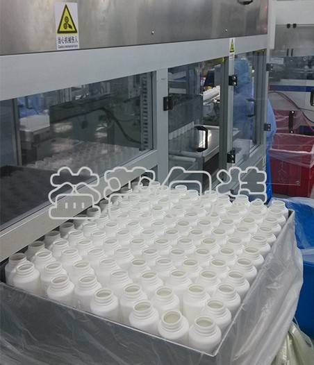 本機由進瓶輸送線、計數(shù)排瓶裝置、產(chǎn)品抱夾升降平移裝置及雙工位平移周轉(zhuǎn)箱組成。 產(chǎn)品由進瓶輸送線送入排瓶推移工位,排瓶推移機構(gòu)將整排推入排瓶臺。達到設(shè)定的行列數(shù)時,抱夾升降平移機械手將整層瓶抱夾裝入周轉(zhuǎn)箱中的塑料袋內(nèi)。裝滿設(shè)定的層數(shù)后,人工將套好袋的空周轉(zhuǎn)箱推入裝袋工位,同時滿箱將推至取出工位,工人完成封口后將滿袋取出。并重新套上空袋。周轉(zhuǎn)箱套袋、滿袋封口及從周轉(zhuǎn)箱取出由人工完成,只需一人操作。