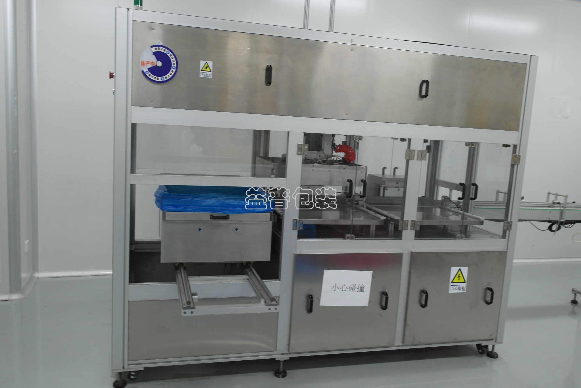 產(chǎn)品由進瓶輸送線送入排瓶推移工位,排瓶推移機構(gòu)將整排推入排瓶臺。達到設(shè)定的行列數(shù)時,抱夾升降平移機械手將整層瓶抱夾裝入周轉(zhuǎn)箱中的塑料袋內(nèi)。裝滿設(shè)定的層數(shù)后,人工將套好袋的空周轉(zhuǎn)箱推入裝袋工位,同時滿箱將推至取出工位,工人完成封口后將滿袋取出。并重新套上空袋。周轉(zhuǎn)箱套袋、滿袋封口及從周轉(zhuǎn)箱取出由人工完成,只需一人操作。